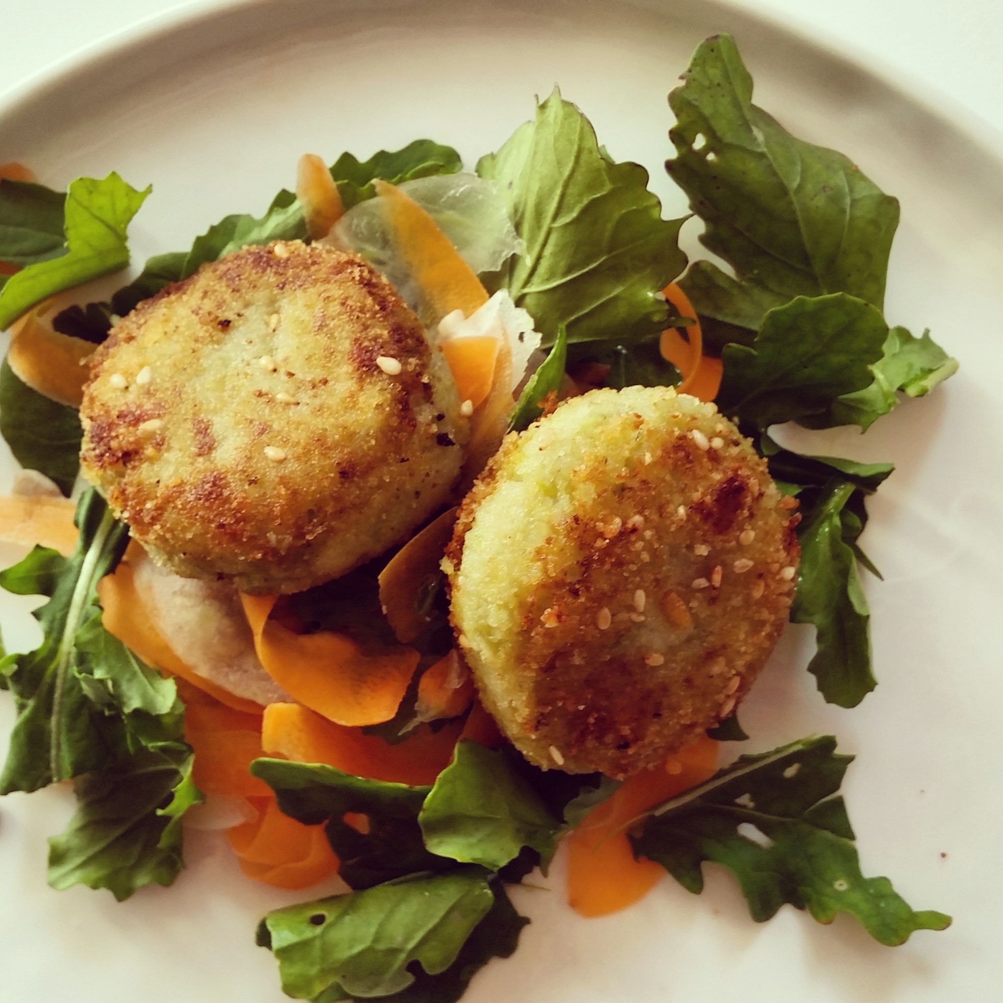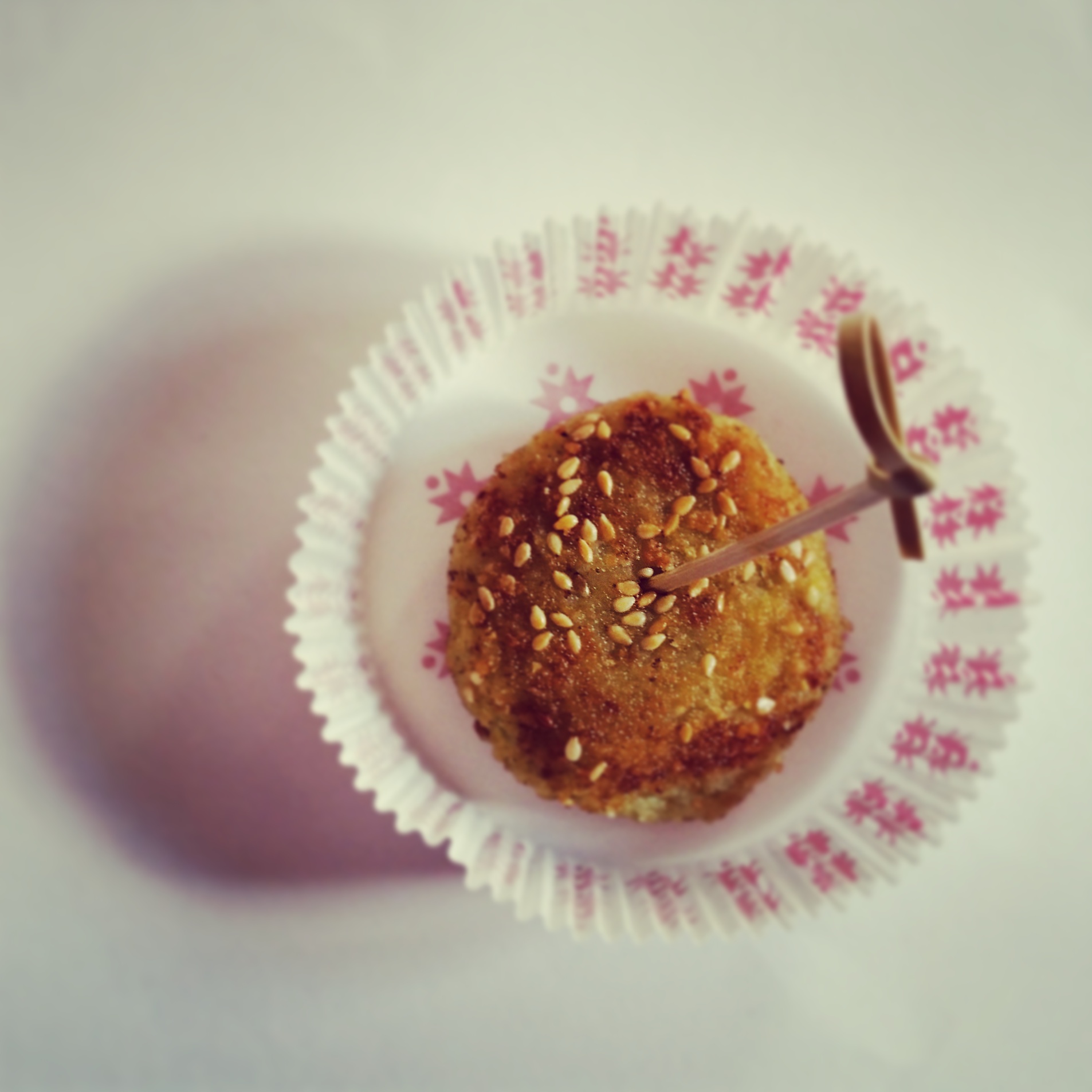 Formare le polpette e passarle nella pangrattato miscelato ai semi di sesamo.