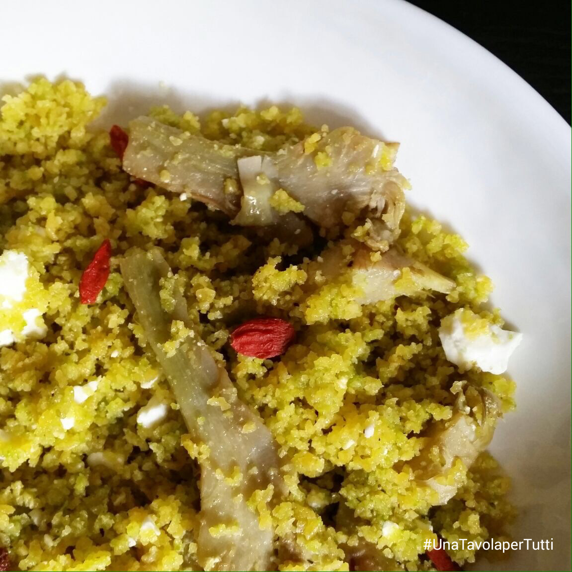 Condire il cous cous con il pesto, se dovesse essere troppo denso diluirlo con un cucchiaio di acqua calda, aggiungere i carciofi trifolati, il caprino e le bacche di goji.