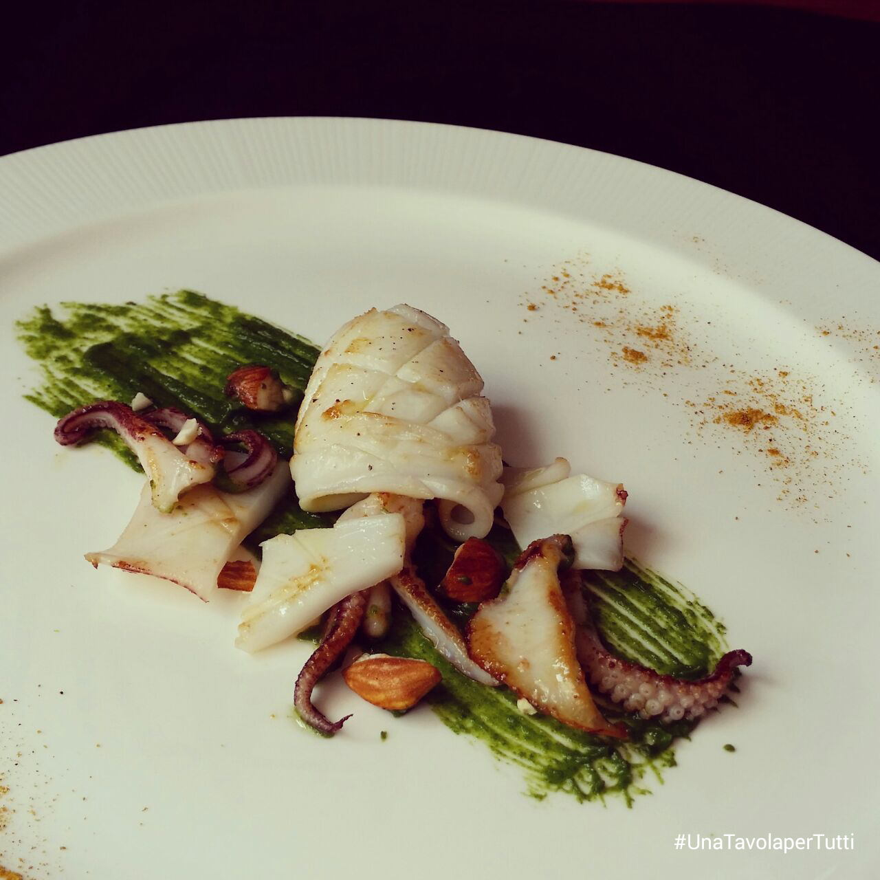 Macchiare il piatto con la crema di senape, adagiare il calamaro e terminare con le mandorle tostate e un filo di olio evo.