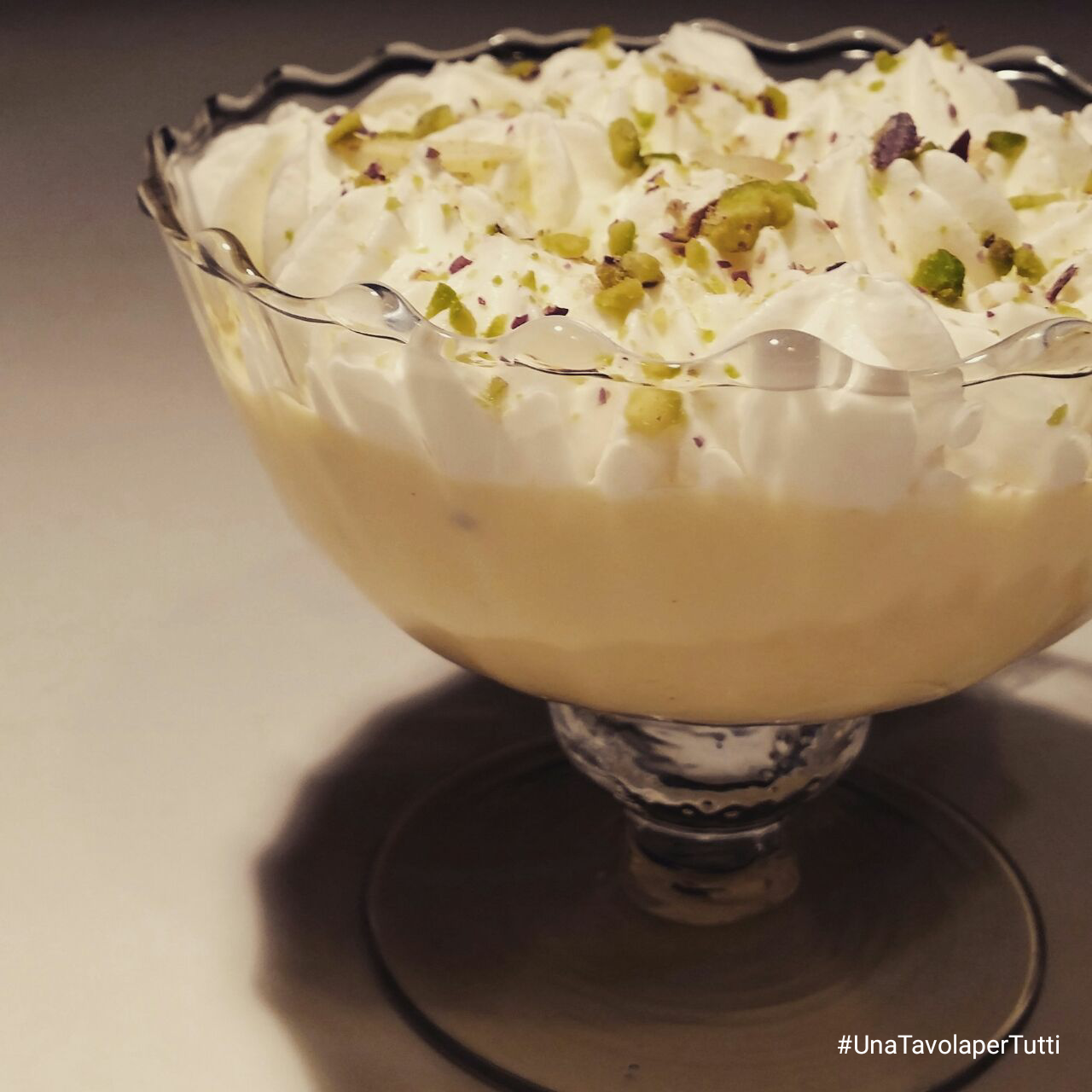 Versare la crema in due coppe, guarnire con panna montata poco zuccherata, granella di pistacchio o cioccolato fuso.