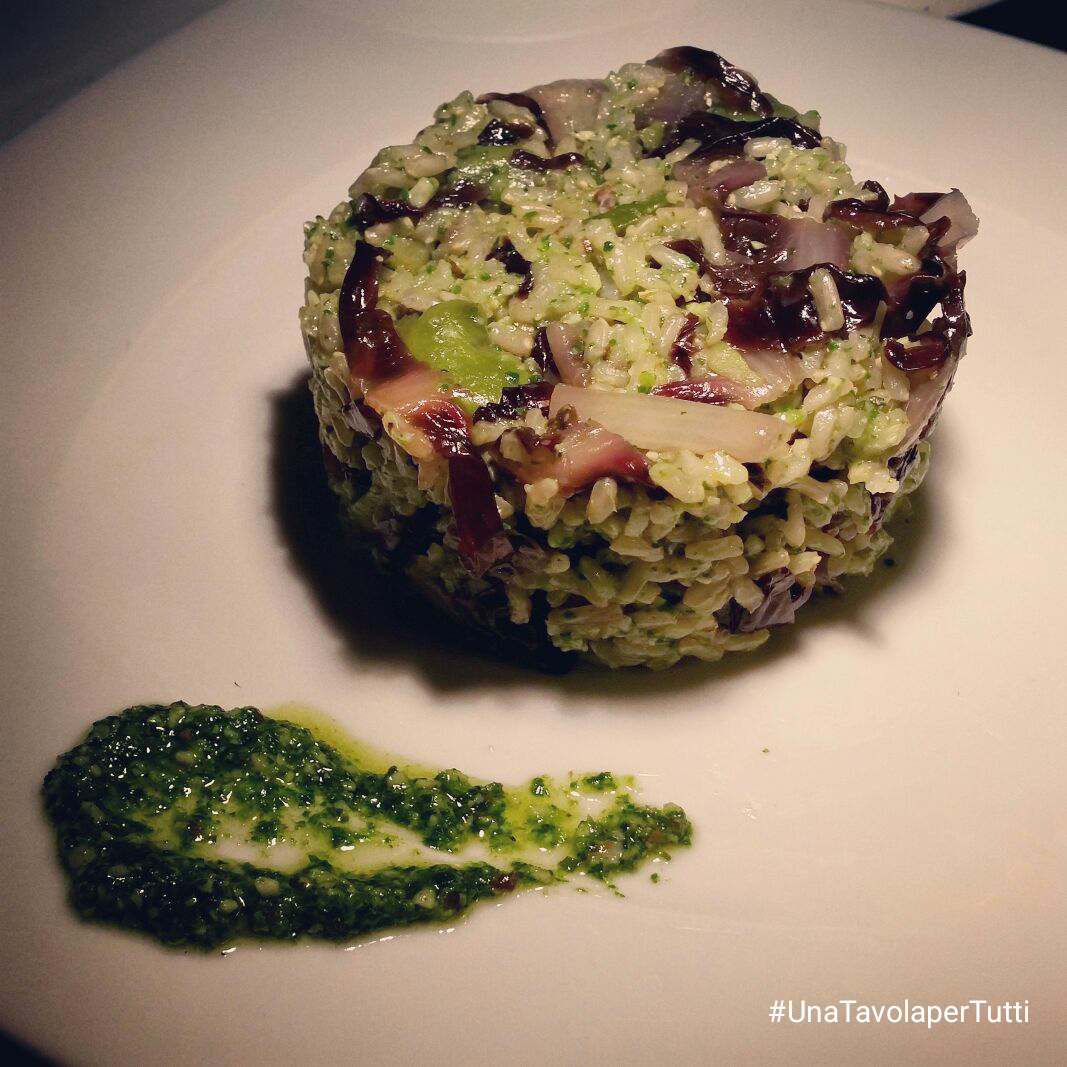 Con l’aiuto di un coppapasta ho messo il riso nei piatti e macchiato con il pesto di rimasto.