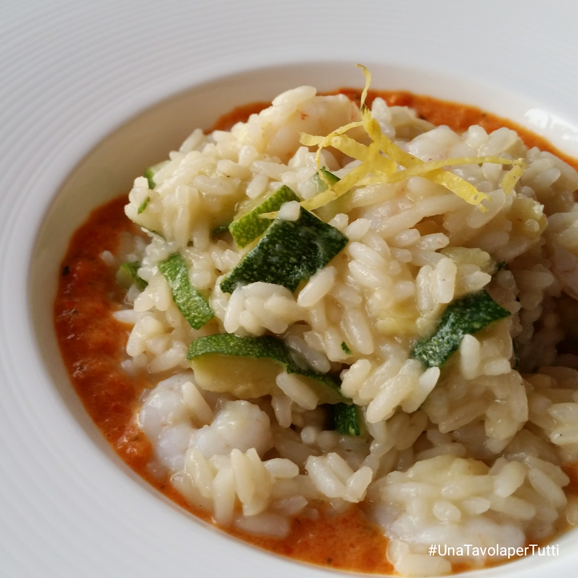 Quasi a fine cottura unire la zucchina e infine aggiungere i gamberi e regolare di sale e pepe, spegnere il fuoco e mantecare con un po’ di burro freddo e la scorza di un limone.
