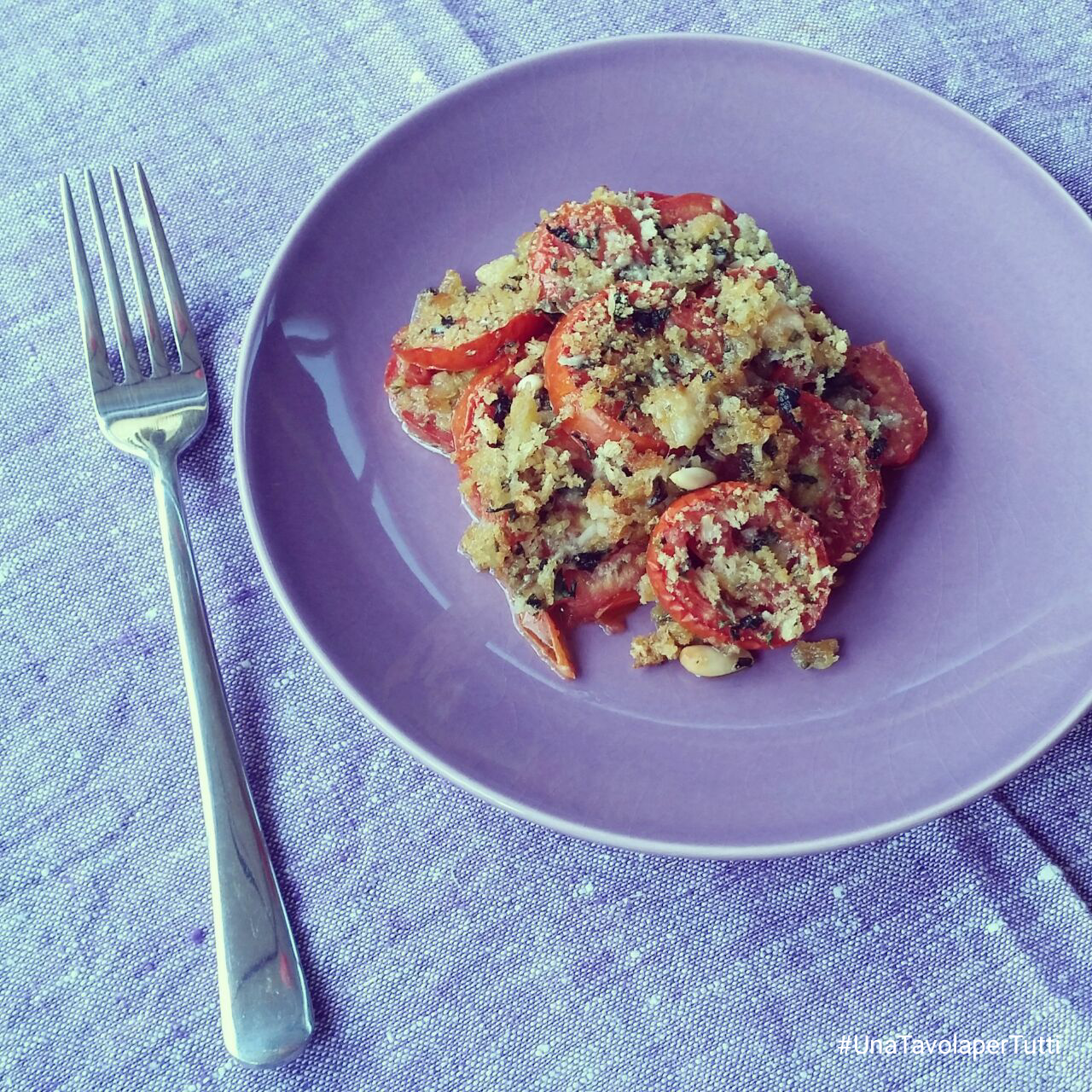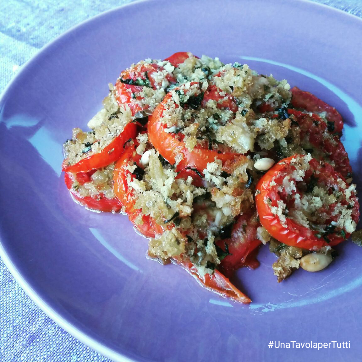 Posizionare le fette di pomodoro in una teglia unta di olio, cospargere con le briciole di pane, le fette di pepato tagliate sottili e condire con un filo di olio, infornare per circa a 15 minuti a 180°.