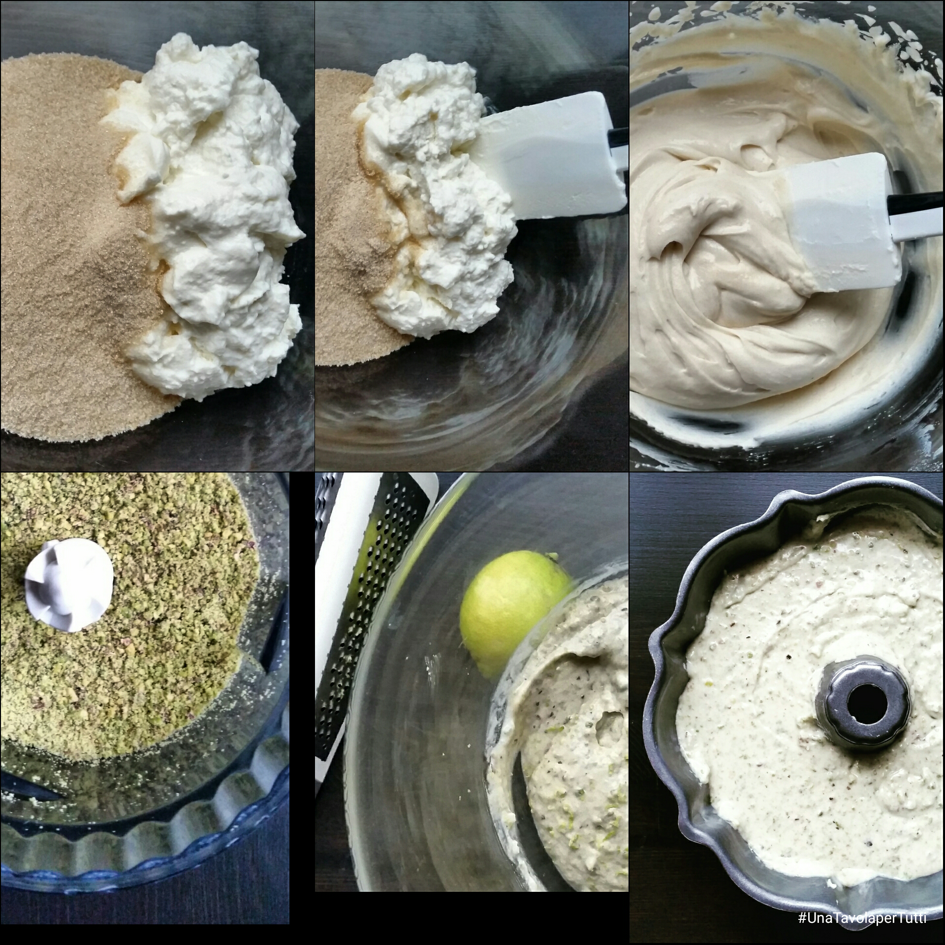 Montare con le fruste la ricotta con lo zucchero, aggiungere la farina di pistacchio, la farina 00 o di riso, il lievito e la scorza grattugiata di un limone.